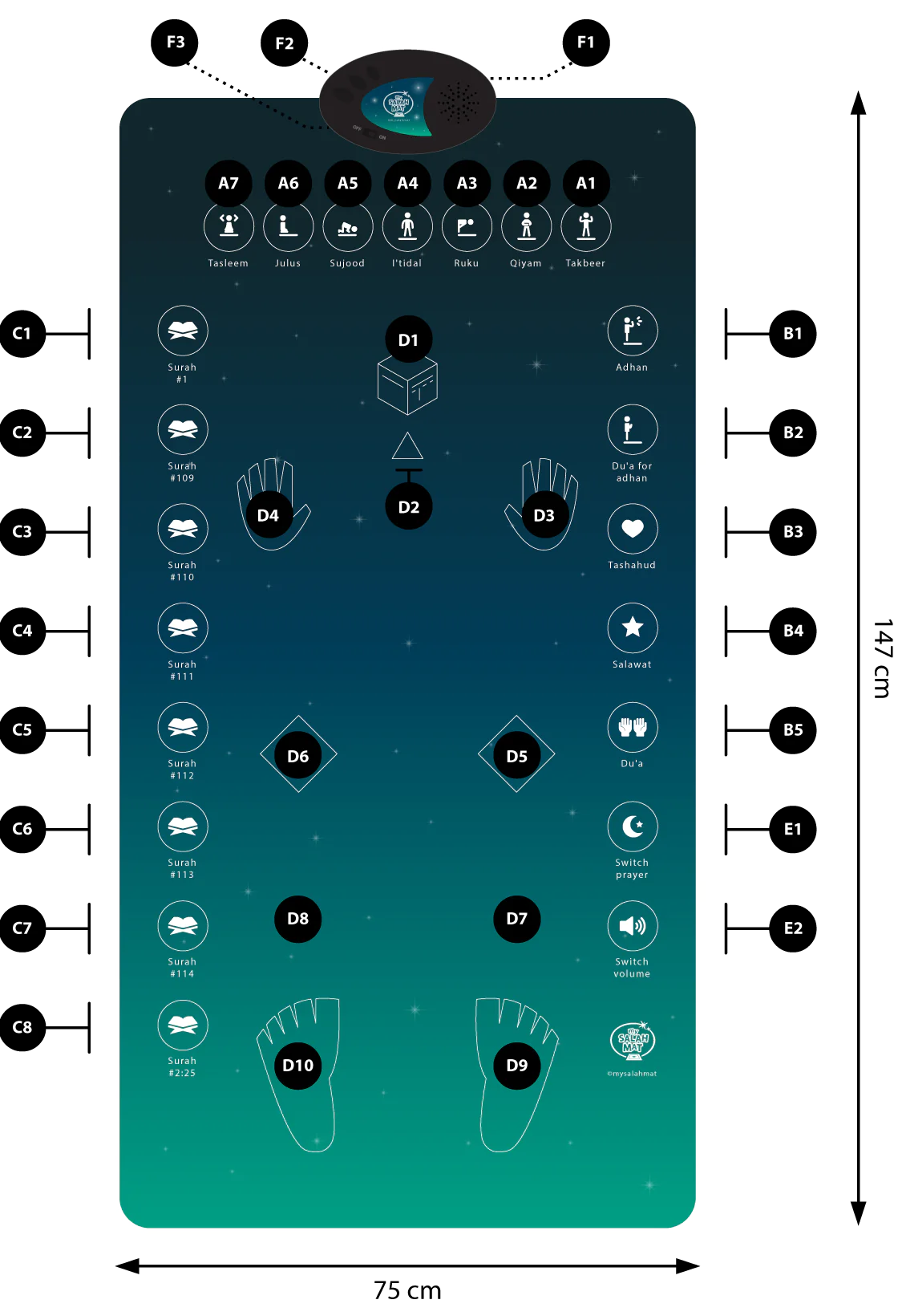 এটি একটি স্মার্ট ইন্টারেক্টিভ জায়নামাজ যা তৈরি করা হয়েছে প্রাপ্তবয়স্ক ও যারা নতুন ইসলাম গ্রহণ করা হয়েছে তাদের কথা মাথায় রেখে এই জায়নামাজ টি তৈরি করেছে বিশ্ব বিখ্যাত আমেরিকান কোম্পানি “My Salah Mat”। জায়নামাজ টি তে রয়েছে কিছু ইন্টারেক্টিভ সেন্সর যা আপনার সিজদাহ, রুকু সহ নামাজের সকল কার্যক্রম ও অঙ্গভঙ্গি এর সঠিকতা নিশ্চিত করবে। জায়নামাজটির সাথে রয়েছে একটি স্মার্ট অডিও ডিভাইস যা আপনাকে সকল নির্দেশনা দিবে। উদাহরণস্বরূপ এখানে রয়েছে অযুর নিয়ম , নামাজের নিয়ত আরো রয়েছে দুআ সহ আরো অনেক চমৎকার সুবিধাদি, এছাড়াও নির্দেশনা দেয়ার জন্য রয়েছে উজ্জ্বল আলোর আইকন এই পণ্য টি মূলত আপনাকে ইসলামের সঠিক নিয়ম অনুযায়ী সালাত আদায় করা শেখাবে। ১০ বছর বা তদূর্ধ্ব যেকোন বয়সের মানুষ এটি ব্যবহার করতে পারবে আর বাচ্চাদের জন্য রয়েছে আলাদা ভেরিয়েশণ। জায়ানামাজ টি সম্পূর্ণ ফায়ার প্রুফ ও ওয়াটার প্রুফ এবং যেমন খুশি গুছিয়ে রাখা যায় সাধারণ জায়ানামাজ এর মত সুতরাং নষ্ট হবার ভয় নেই । এছাড়াও জায়নামাজ টি কিভাবে কাজ করে আরো বিস্তারিত তথ্য জানতে বা ভিডিও দেখতে হলে নিচে স্ক্রল করুন।